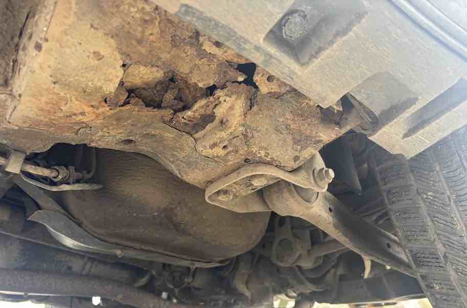 Tohle už není povrchová koroze, ale prorezlá nosná část rámu. Opravit se to dá vyříznutím a navařením nového materiálu, ale záleží na rozsahu – pokud je shnilá větší část rámu nebo úchyty náprav, je to spíš na konec životnosti auta. Doporučuji zvednout auto a nechat zkontrolovat celý rám, jinak se nedá posoudit, jestli má oprava smysl.